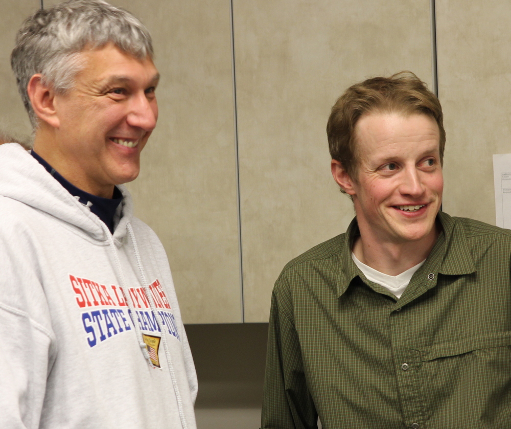 Bob Potrzuski (l.) and incumbent Matt Hunter celebrate their decisive wins in the race for Sitka Assembly. (KCAW photo/Emily Kwong)