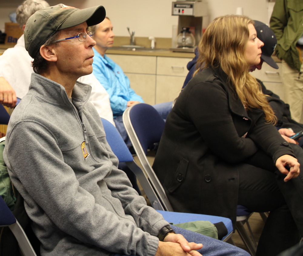 Eric Van Cise (l.) watches polling results in the Sitka Firehall. Jennifer Robinson (r.) lost her seat on the school board in the biggest surprise of the evening. (KCAW photo/Emily Kwong)