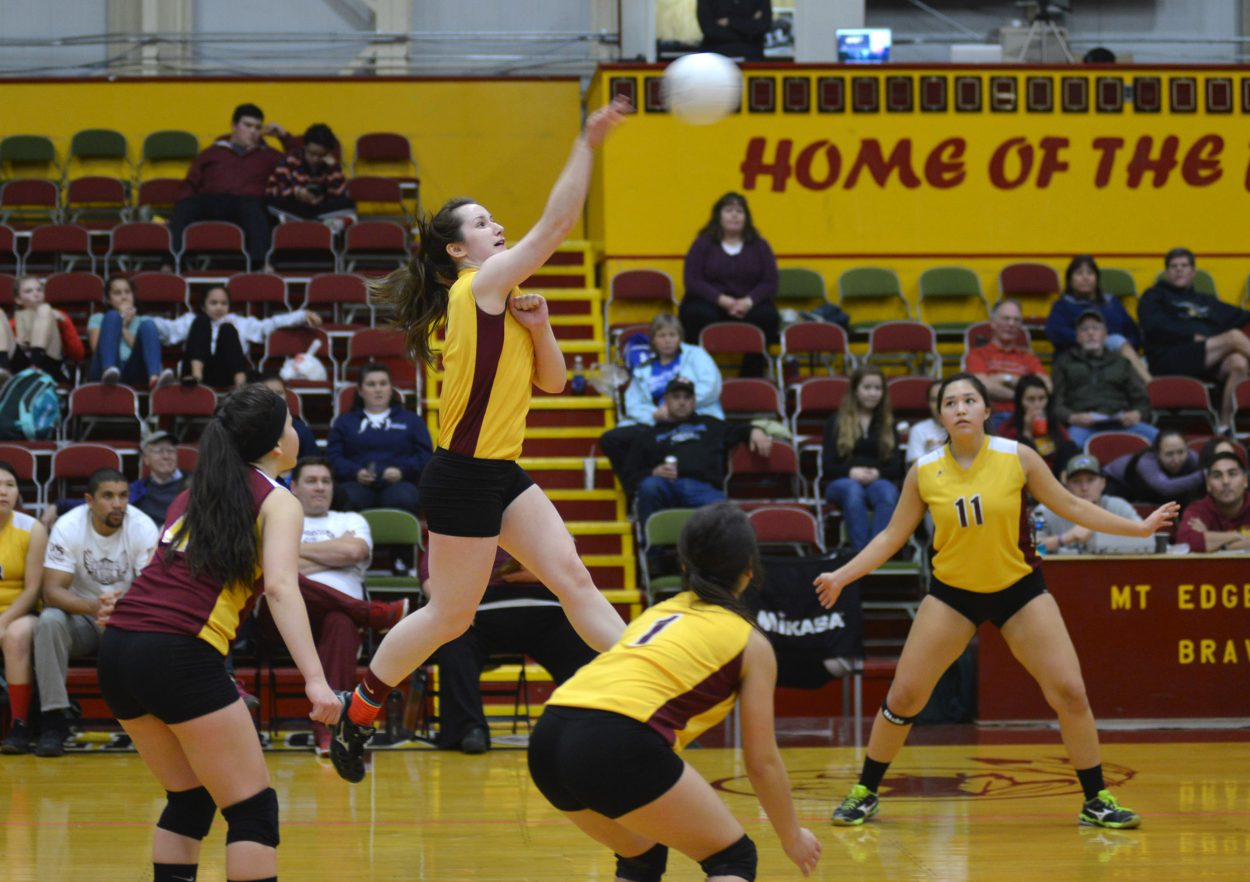 Mt. Edgecumbe senior Payton Weisz spikes the ball as Rachelle Persson (4), Jewel Galaktionoff (1) and Brandolyn Ahyakak (11) look on during a game earlier this season at the B.J. McGillis gymnasium. (Daily Sitka Sentinel photo by James Poulson)
