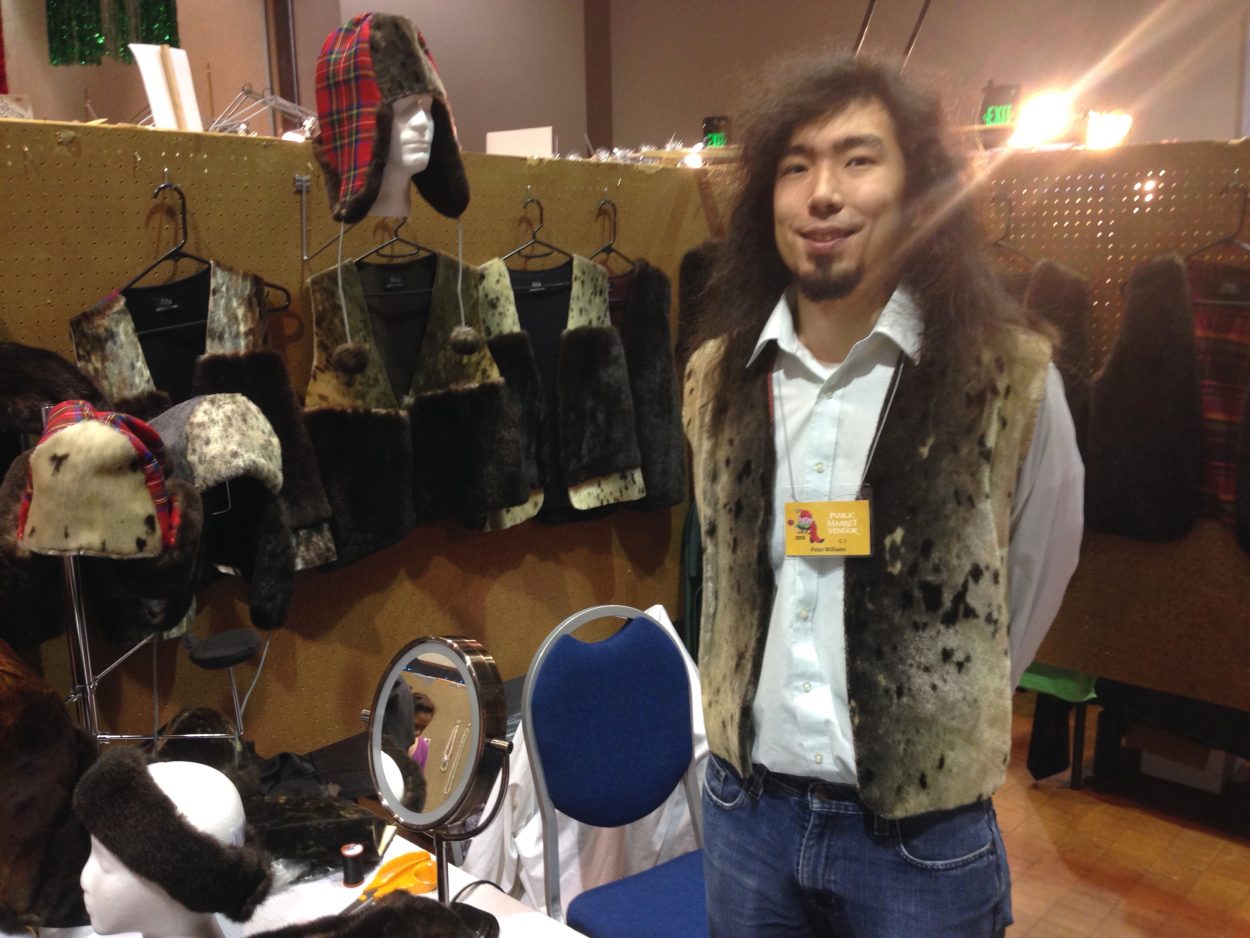 Peter Williams of Sitka displays his seal and sea otter products during the 2013 Juneau Public Market. (Photo by Ed Schoenfeld/CoastAlaska News)