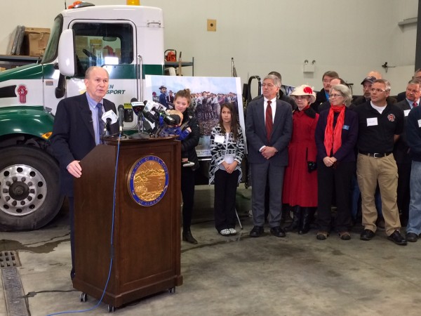 Gov. Walker unveils his budget plan on Wednesday, Dec. 9. Sitka Mayor Mim McConnell looks on. (Photo by Rachel Waldholz/APRN)