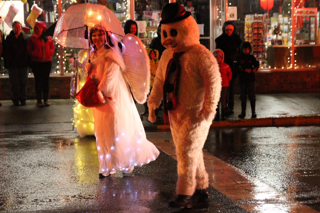 An angel hands out candy with Frosty the Snowman at the 2015 Landlubbers Christmas Parade in Sitka. (Photo by Michael Jamros)