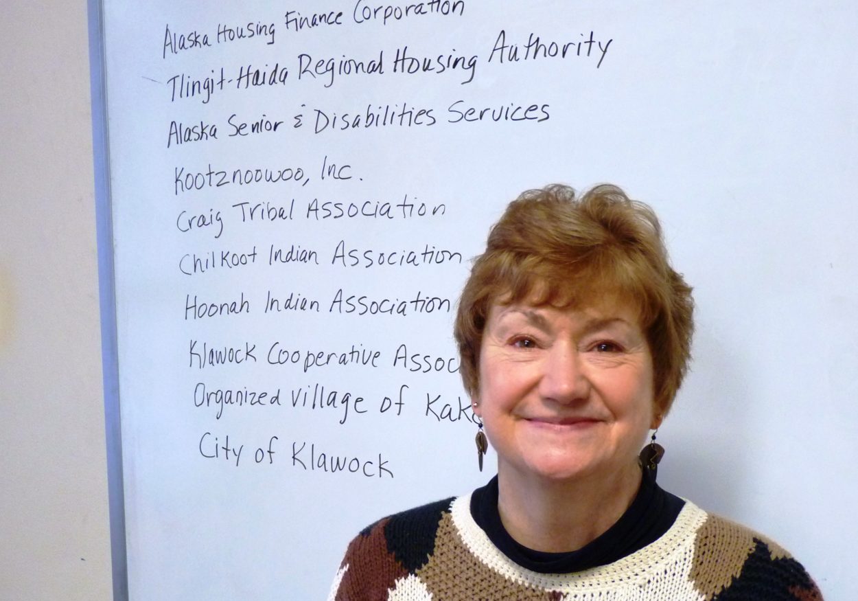 Southeast Senior Services Director Marianne Mills poses with a partial list of other organizations it works with. (Ed Schoenfeld,/CoastAlaska News)