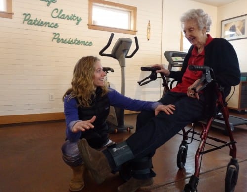 Haines physical therapist Marnie Hartman works with 92-year-old patient Marge Ward. Hartman said most of her business comes from people 65 and older. (Photo by Emily Files/KHNS)