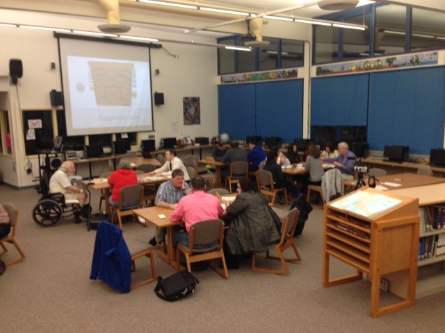 The Sitka School Board at work during a budget visioning session on March 2. The board is taking a different approach to the budget this year, and focusing on information-gathering and collaboration, before making large cuts. (KCAW photo/Robert Woolsey)