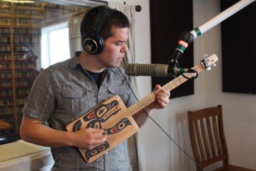 Mark Sixbey is a Tsimshian woodcarver who grew up in Metlakatla. He brought a homemade guitar to the KCAW studios today (4-29-16). (Emily Kwong/KCAW photo)