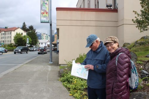 Paul and Margaret Gleva of Loveland, Colo. visiting downtown Sitka. The two were passengers on the first cruise ship of the season–the Norwegian Pearl. (Brielle Schaeffer/KCAW photo)