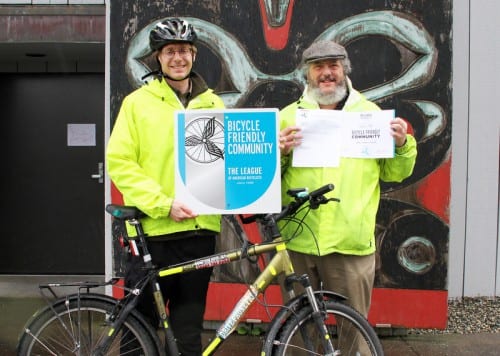 Doug Osborne and Charles Bingham, members of the Sitka Bicycle Friendly Community Coalition, pose with their silver-level designation. Sitka was the first community in Alaska to earn a bronze designation in 2008. (Photo courtesy of City of Sitka)