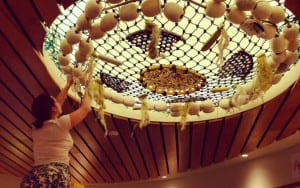Local artist and educator Heather Bauscher installing a piece fashioned out of marine debris by students at Pacific High School