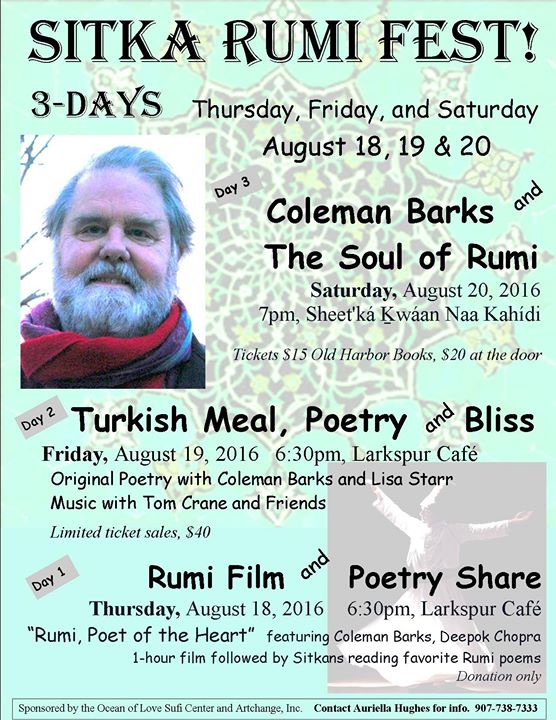 The festival continues with a Turkish meal on Friday (08-19-16) at 6:30 p.m. at the Larkspur and a community poetry reading, featuring poets Coleman Barks and Lisa Starr, on Saturday (08-20-16) at 7 p.m. at Sheet’ka Kwaan Naa Kahidi. Tickets are available at the door and at Old Harbor Books.