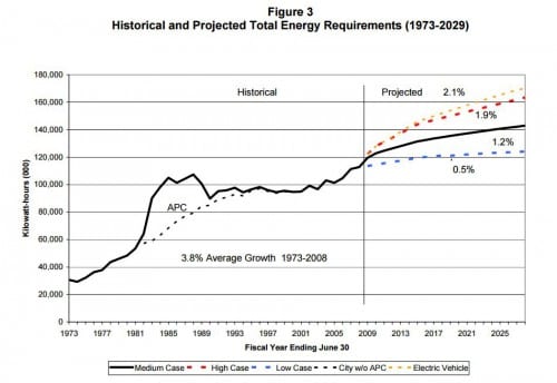 In the four years since the dam was approved, usage has declined to 104 million kwhr/year. With customers using less, the city is short several million dollars to keep up with bond payments. (Graph from CBS Utility Department)
