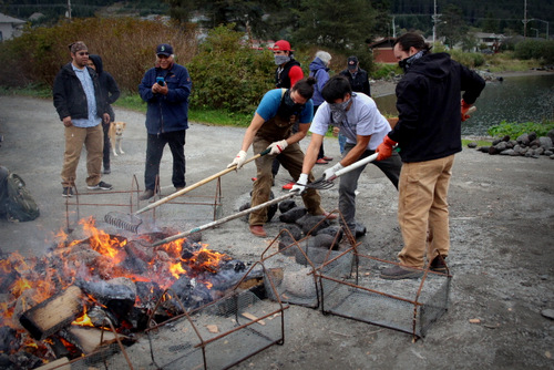 Carvers rake back the embers to reveal the heated lava rocks, which they’ll shovel into the metal baskets. (KCAW Photo/Emily Russell)