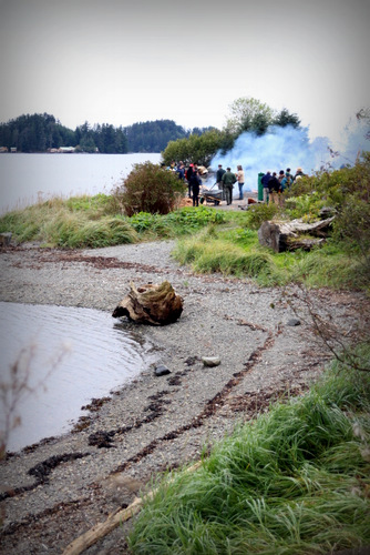 The steaming on Sitka’s Eagle Beach attracted friends and family of the carvers along with Park Service employees. (KCAW Photo/Emily Russell)