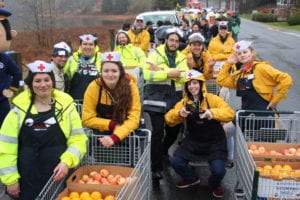 Employees from Seamart hand out apples and oranges at the 2016 Alaska Day parade. (KCAW Photo/Emily Russell)