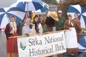 Employees from Sitka National Historical Park lining up to march in the 2016 Alaska Day parade. (KCAW Photo/Emily Russell)