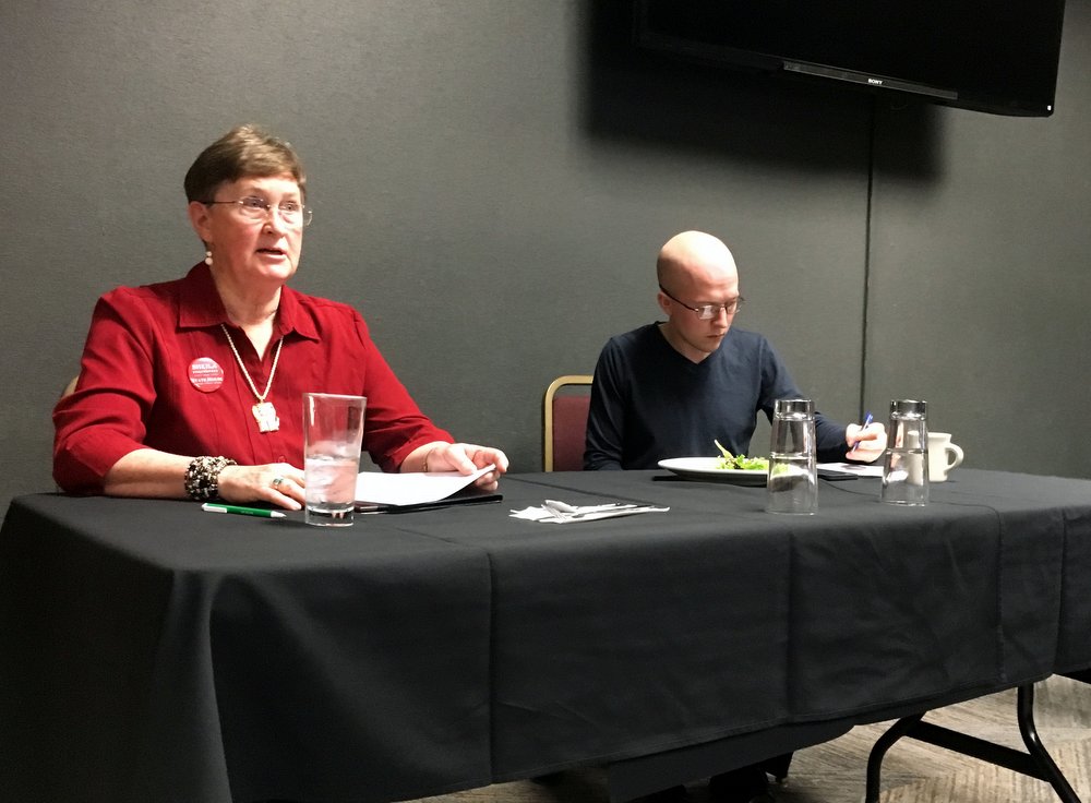 Finkenbinder (l.), a Republican, argued that her position in the majority would give her influence. Kreiss-Tomkins, the Democratic incumbent, suggested that the math this election might put him in the majority. (KCAW photo/Robert Woolsey)
