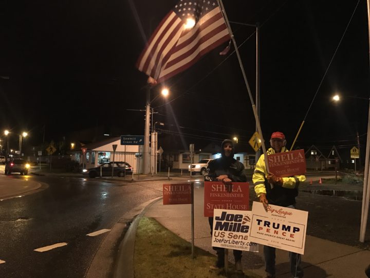 Ed Gray and Ralph Junker wave campaign signs in downtown Sitka on election day. (Emily Russell/KCAW Photo)