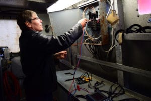Mike Gaffney connects the power quality analyzer to the fishing vessel’s electric panel. (Photo courtesy of Sustainable Southeast Partnership/Bethany Goodrich.)