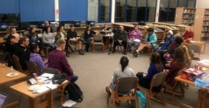 Sitka High students also were concerned about the Math program. Principal Lyle Sparrowgrove was willing to hear them out, “But the world’s not asking for the things I had as a kid. They’re asking for different things now.” (KCAW photo/Robert Woolsey)