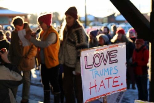Sitka is divided too. Sitka’s Republicans favored Trump as the party nominee, while Sitka Democrats fanned out for Bernie Sanders. During the election, the vote for president was nearly even – with 1,258 for Hillary Clinton and 1,144 for Donald Trump. And prior to the March, a Facebook feud carried on for days over whether the march did more to divide the town than unite.