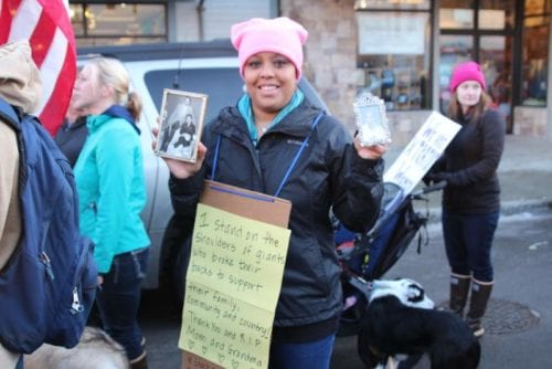 Melissa Harrison carried two framed pictures, one of her mother and one of her grandmother. She marched in their honor, her sign saying, “I stand on the shoulders of giants.” (Emily Kwong/KCAW photo)