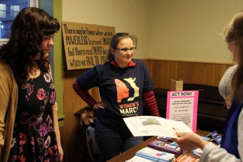 Sarah Ferrency distributes an action list for supporters of Planned Parenthood after the march. “A march feels really good, but this can’t be it. If this is it, the movement dies,”she said. (Emily Kwong/KCAW photo)