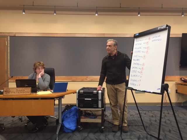 Human Resources Director Mark Danielson tallies votes for the Sitka Assembly, reducing the list for city administrator from 16 candidates to eight. 48 initially applied. (Emily Kwong/KCAW photo)