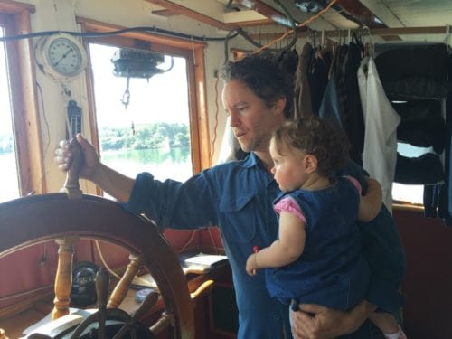 Brendan Jones, pictured with his daughter Haley, has won the Alaskana Award for his debut novel, “The Alaskan Laundry.” The book’s protagonist, like Jones, refurbishes a tugboat. (Emily Kwong/KCAW photo)