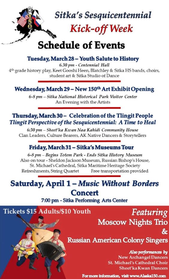 After the transfer, Sitka – then called New Archangel – was Alaska’s capital. The city is commemorating the 150th anniversary of the Treaty of Cession with a week of events focused on Russian, American, and Native culture. There’s a youth variety show, a concert of Russian folk music, and an art exhibit at Sitka National Historical Park.