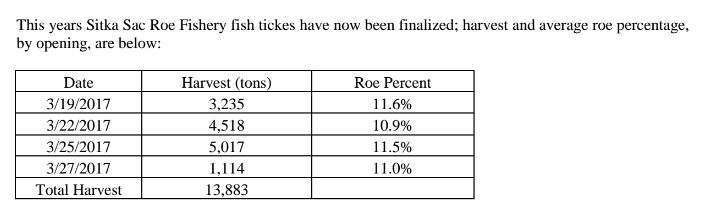 Final totals from the Sitka Sound herring fishery are also in. The fleet harvested 13,883 tons of their 14,700 ton quota this season. On average, roughly eleven percent of the fish had mature roe.