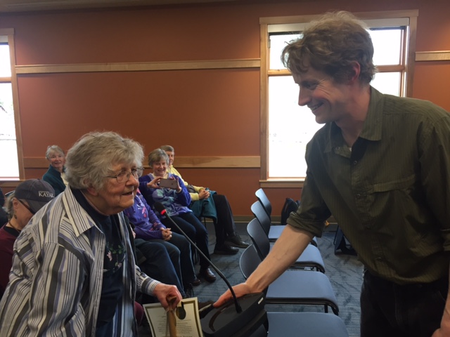 Dorothy “Brownie” Thompson was honored by the Sitka Assembly for her volunteer work maintaining Halibut Point State Recreation Area. (Emily Kwong/KCAW photo)