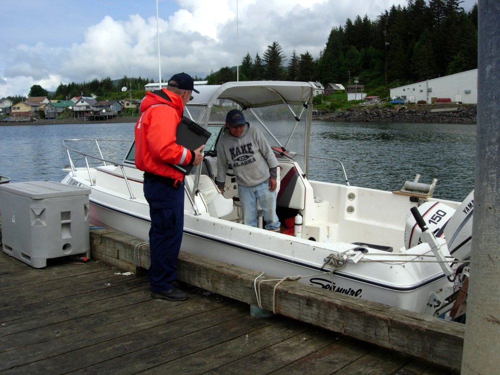 Coast Guard Auxiliary member Rick Rogers conducts a vessel safety exam at the pier in Kake, Alaska, in 2011. The Coast Guard Auxiliary is made up of approximately 34,000 volunteers. (USCG photo/Kate Rogers)