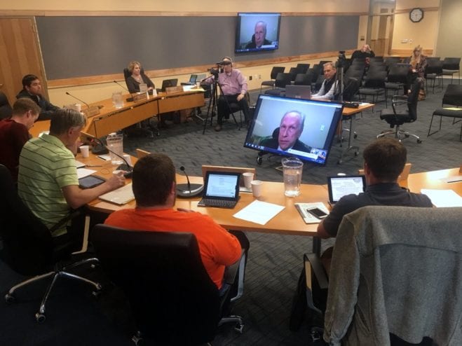 Interim administrator candidate Phillip Messina interviewed via Skype from the offices of Prothman, in Issaquah, Washington. In addition to 28 years working in city government, Messina has also worked for Prothman as a recruiter. Mayor Matt Hunter called it “the perfect recipe” for guiding Sitka toward a permanent hire. (KCAW photo/Robert Woolsey)