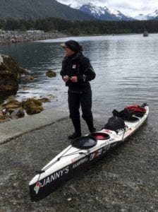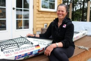Hoffmeister’s boat is a sleek, black-and-white, custom-built fiberglass kayak. It’s one of five in her fleet. She’s shipped three of them here to the US, and she has two in reserve back in her home of Husum, Germany, just north of Hamburg. She plans to paddle the one she’s in now as far as Homer or Kodiak this summer, then return to Seattle next spring and begin paddling south. After three months of that, she’ll fly up to Kodiak or Homer and resume her trip northward in summer 2018. Repeat yearly, until she arrives in New York.