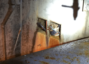 The electrical conduit inside one of the Green Lake dam tunnels. A leak has allowed water to be released down the conduit and into the Green Lake powerhouse. (Photo courtesy of CBS Electric Department)