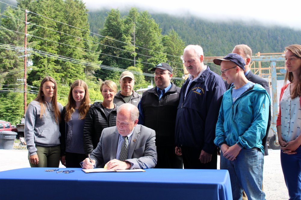 Governor Walker signs Senate Bill 3. Looking on, from left to right, are Allen Marine’s Zadie Allen, Zia Allen, Lauren Allen, Dave Allen, and Jamie Cagle, Senator Bert Stedman, DOT Commissioner Marc Luiken, Representative Jonathan Kreiss Tomkins, and DOT legislative liaison Alida Bus. (Emily Kwong/KCAW photo)