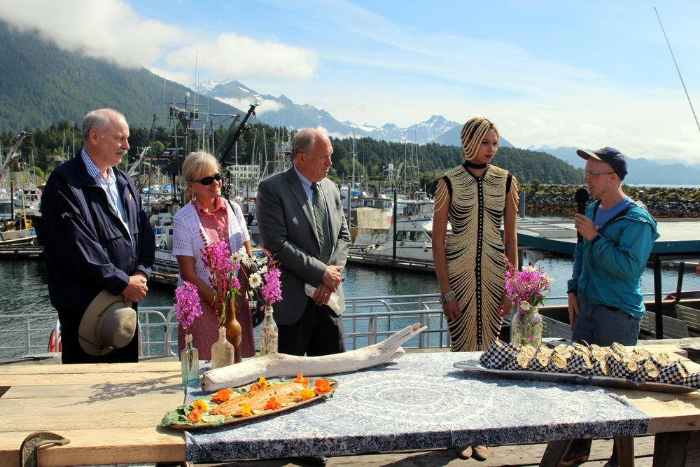 Alaska Governor Bill Walker and First Lady Donna Walker receive a coho, prepared by Colette Nelson of Ludvig’s Bistro and presented by Gavi Stromer in a salmon-bone dress made by Cynthia Gibson. The salmon-themed celebration was organized by local fisherman and organizations. (Emily Kwong/KCAW photo) Gavi Strumer