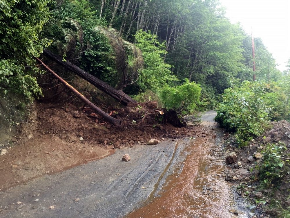 The road leads to the city’s Blue Lake hydroelectric dam. A crew from the Electric Department discovered the slide on Friday morning (8-18-17) as they were en route to a routine inspection of the dam. Although the slide was promptly cleared, more material sluffed down the mountain later, as rains continued.