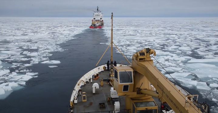 The Canadian icebreaker Sir Wilfred Laurier cuts a path for the Maple through Victoria Strait. As part of its mission, the Maple served as a platform for oceanographic research that has shown changing conditions in the Arctic. (USCG image/Petty Officer 2nd Class Nate Littlejohn)