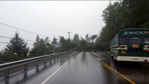 A tour bus with passengers from the Seven Seas Mariner encounters the slide, which originated 200 feet up the hillside. The passengers were later shuttled to their ship via boat. (Cassie Mendoza photo)
