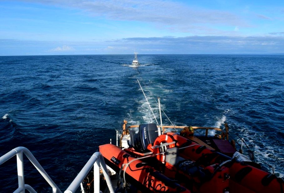 Although the crew of the Ruby Dawn was able to make temporary repairs, the Chandeleur took the boat under tow for the trip to Yakutat.