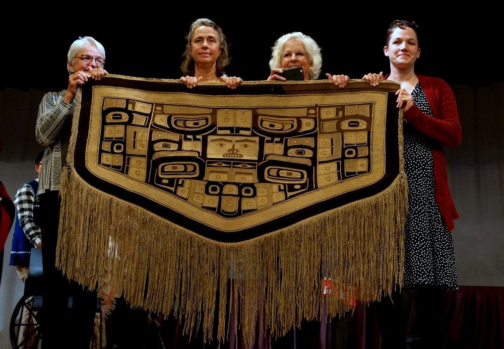 At least four generations of the Davenport family have grown up with the “Diving Whale” blanket. But, as Amy Davenport told the audience last Thursday (9-14-17), “There came a time when this blanket needed to come back.” (Daily Sitka Sentinel photo/James Poulson)