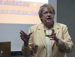 Greater Sitka Legacy Fund board member Connie Sipe speaks to the Sitka Chamber of Commerce in 2013 (Photo/KCAW)