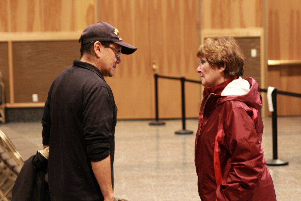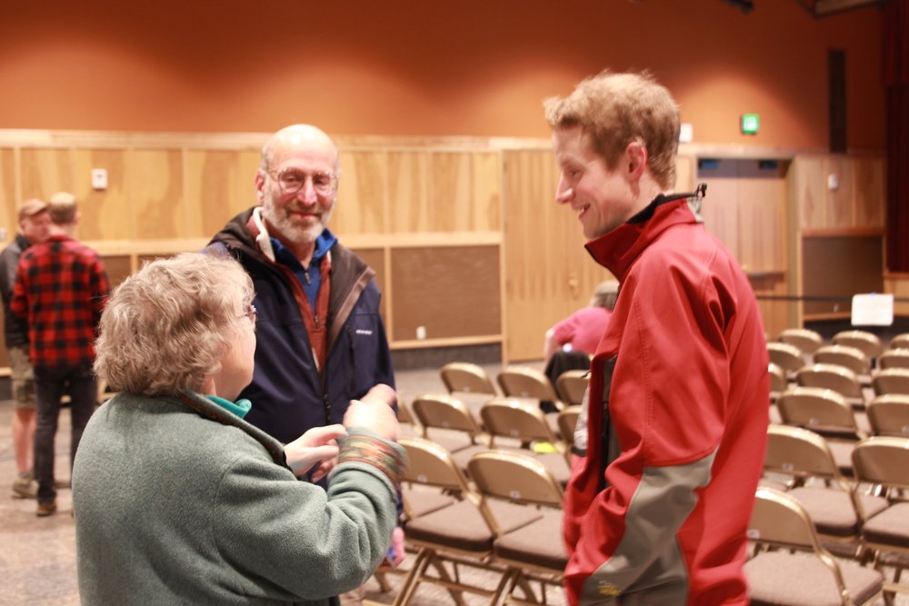 Dr. Richard Wein was the front-runner for the Sitka Assembly race, garnering over 1300 votes. He spoke with Mayor Matthew Hunter and Nancy Yaw Davis of Sitka after the unofficial results were declared. (Emily Kwong/KCAW photo)