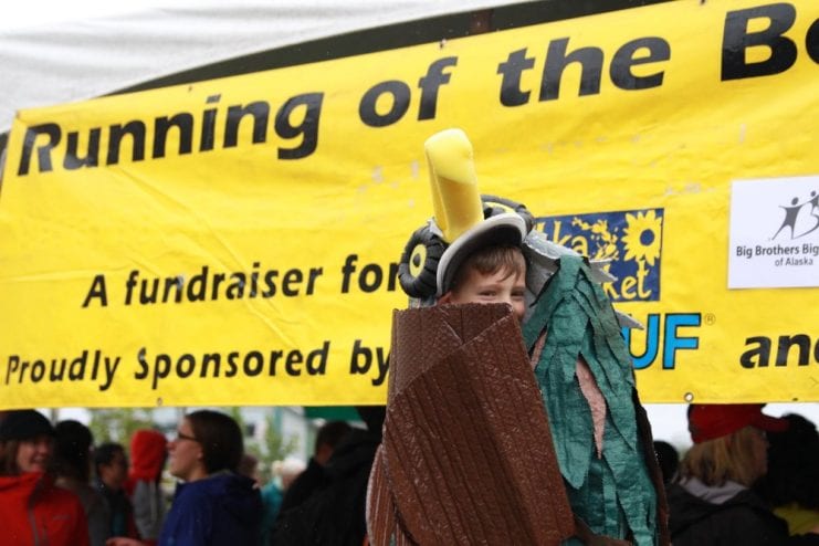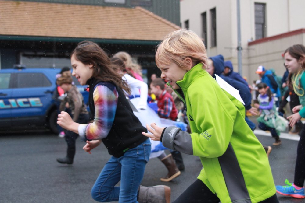 Front runners in Sitka’s Running of the Boots, the informal foot race marking the end of the 2017 visitors seasons. This year saw 241 ports of call with ships big and small, few cancellations, and a downtown people mover (Emily Kwong/KCAW photo)