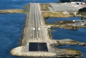 “A good, safe airport,” says Binder, referring to Sitka’s Rocky Gutierrez Airport, which often makes the top 10 lists on social media of “the scariest airports.” Binder says the state has stockpiled material to fill in the lagoons and build a parallel taxiway, but negotiations with the BLM for the final land purchase have been moving slowly. (Coast&Harbor Engineering photo)