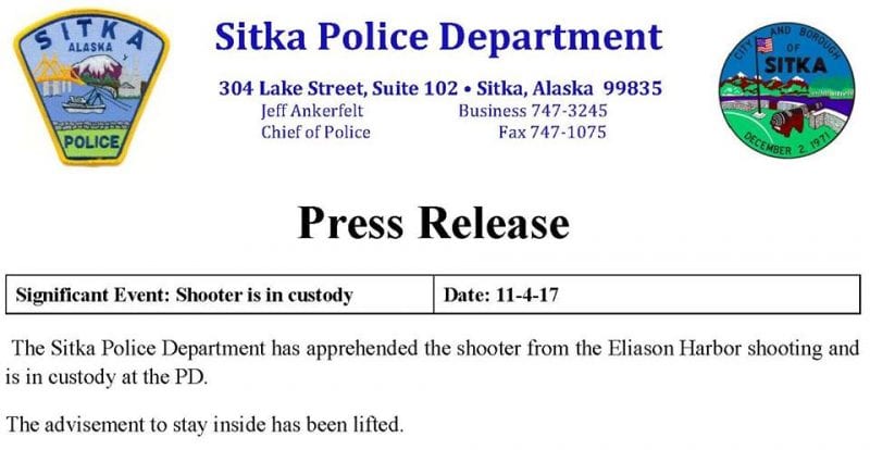 City reports that the suspect is in custody and the Sitka Police Department has lifted the lockdown.