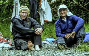 The secret is in the feet. Dan Evans (l.), 56, and Eric Speck, 48, relied on “game wisdom” to find routes through the rugged valleys of Baranof Island. But they also applied common sense: They built large fires almost every night (even in the rain) to dry out their boots. (Dan Evans photo)
