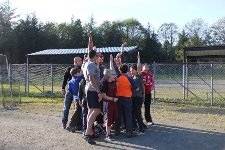 The boys of Boys Run doing their cheer at the end of practice “I toowu klatseen! Photo/Rebecca Foster