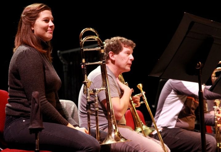 “Mild panic fits,” says Roger Schmidt (center). A full-time arts administrator with serious performance chops, he still has to up his game to play with full-time musicians like Vanessa Fralick (l.), associate principal trombone of the Toronto Symphony. (KCAW photo/Robert Woolsey)